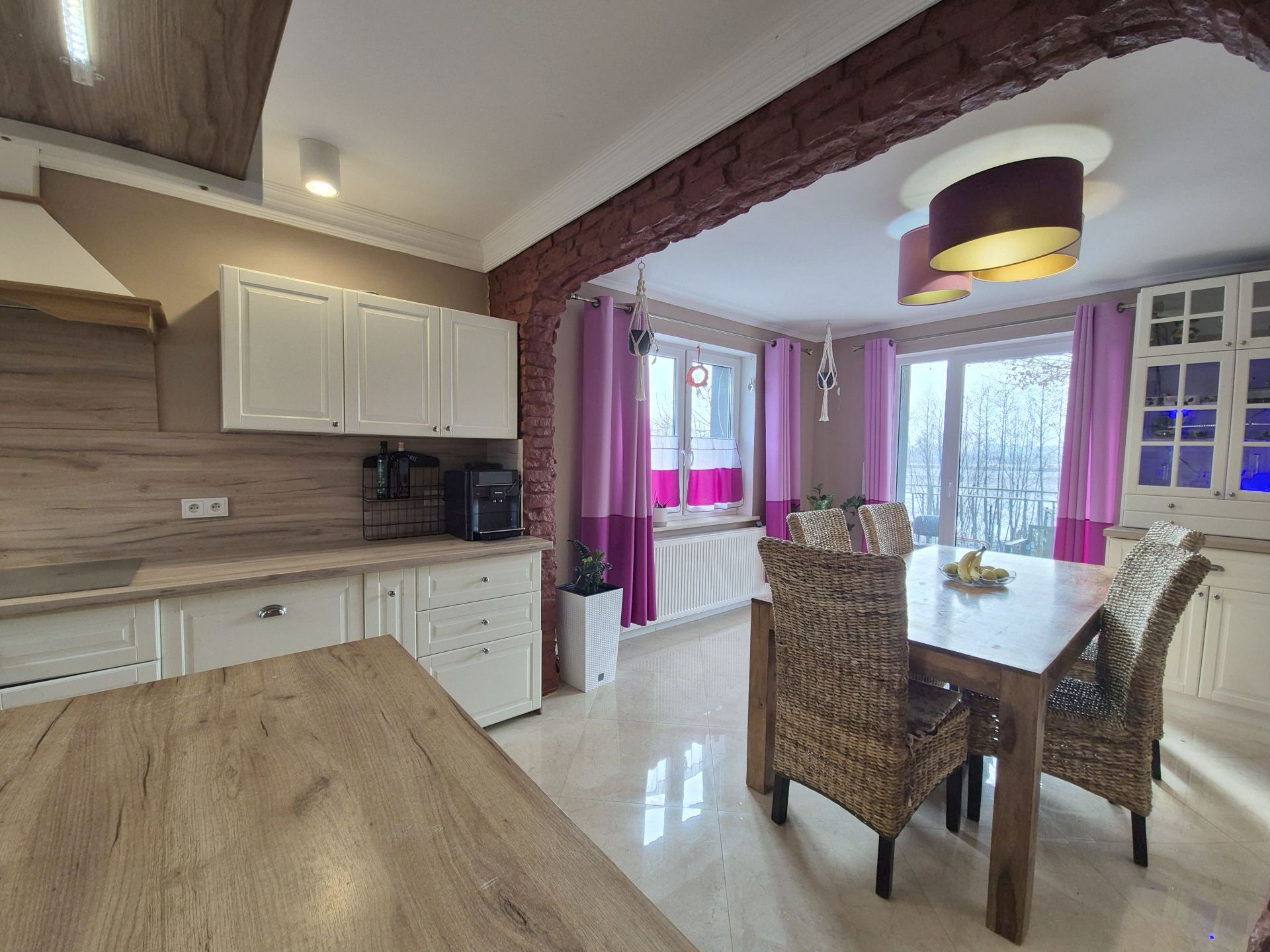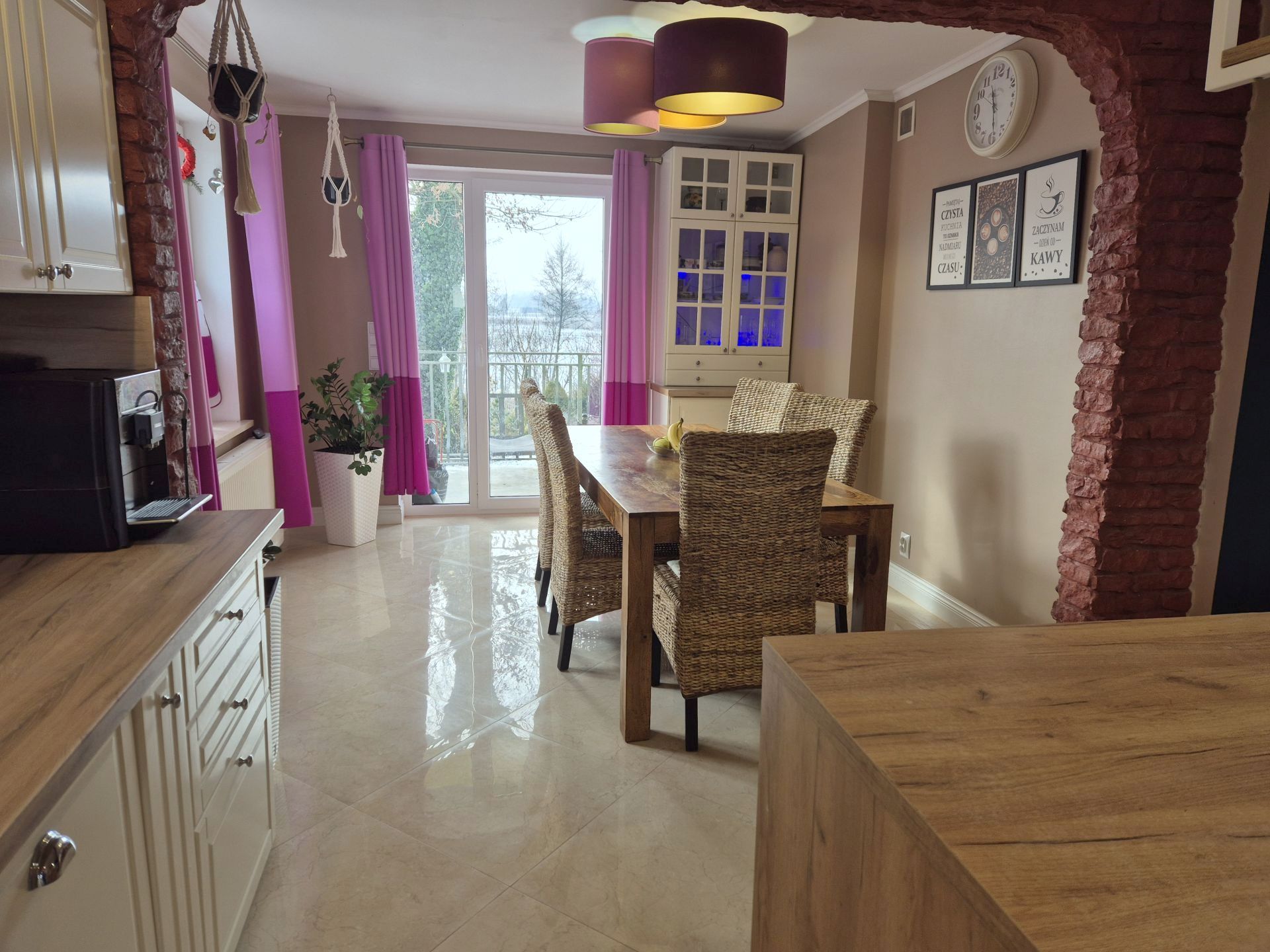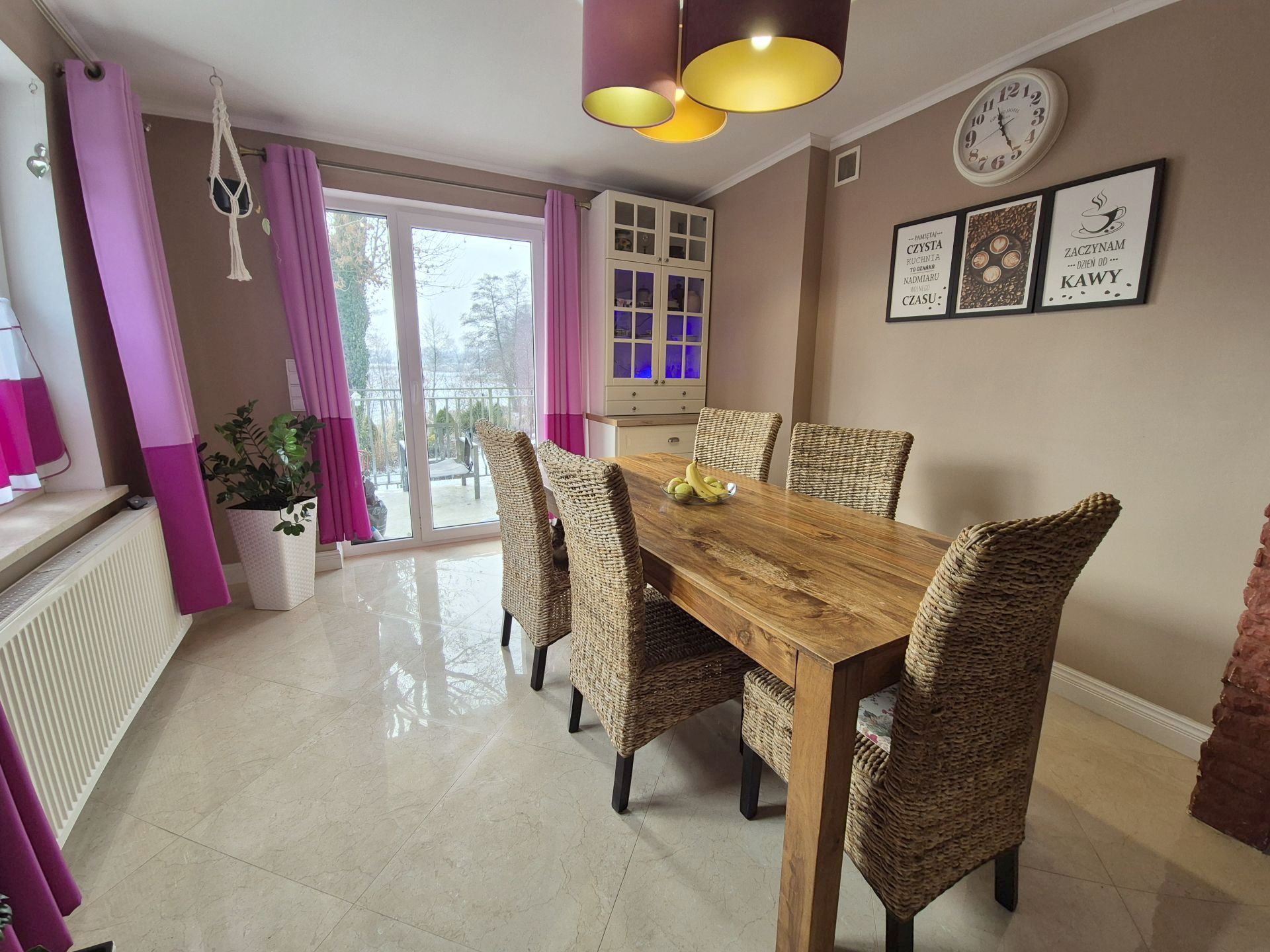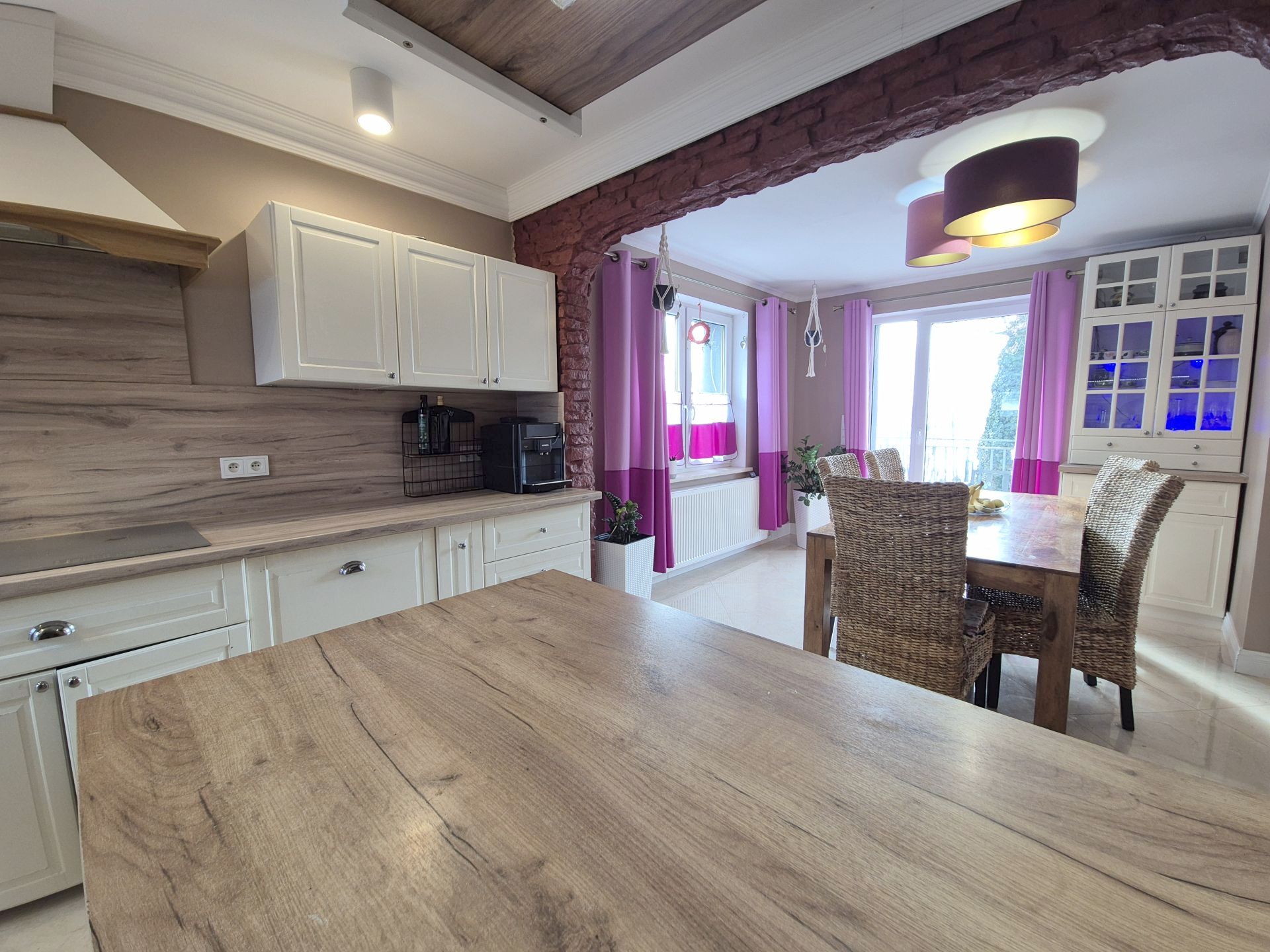 W salonie i jadalni wyjście na taras z zejściem do ogrodu.