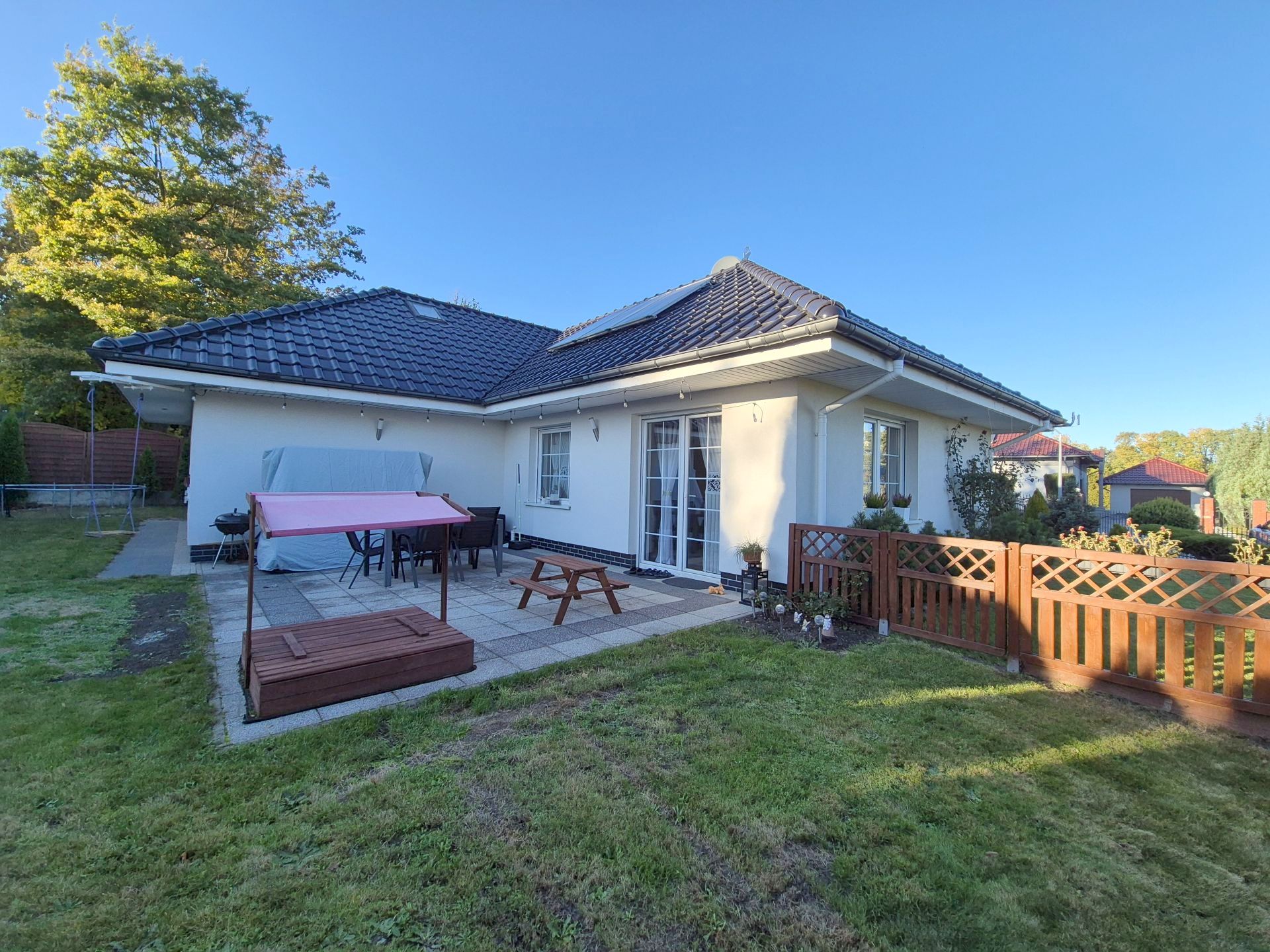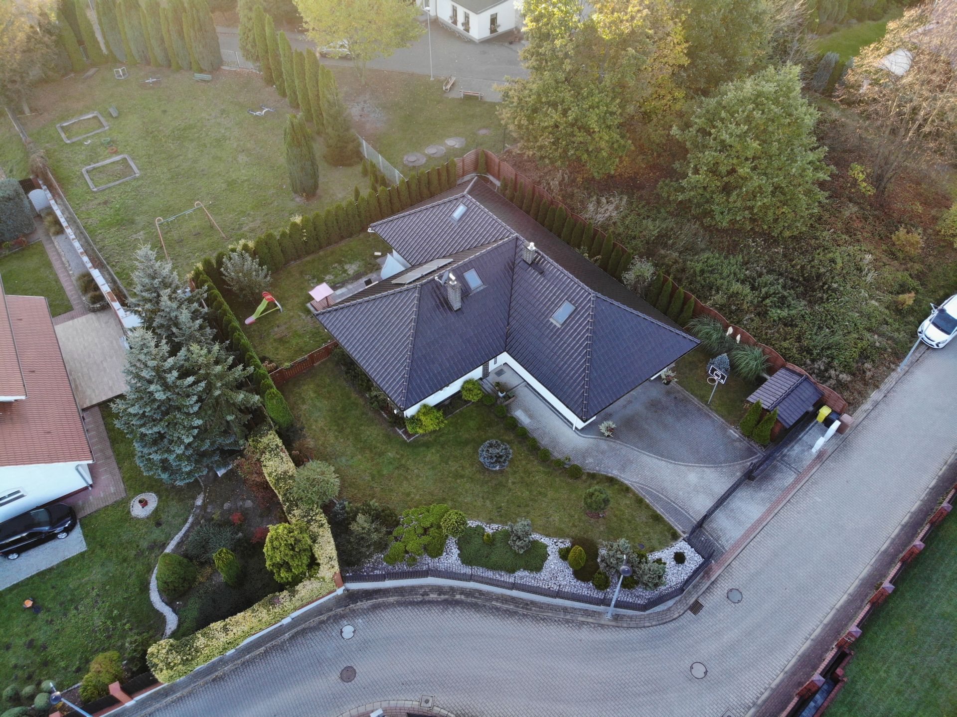 Działka o regularnym kształcie, posiadająca powierzchnię 713 m2. Pięknie urządzona – z dużym tarasem – około 22 m2.
